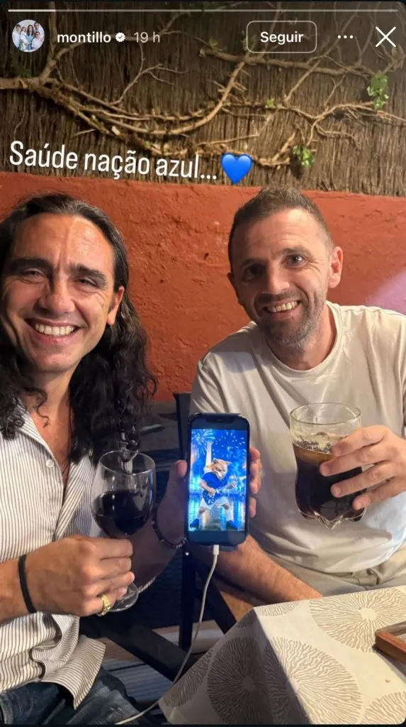 Um encontro de ídolos do Cruzeiro mexeu com as lembranças dos torcedores nas redes sociais. O ex-lateral Juan Pablo Sorín e o ex-meia Montillo, postaram uma foto juntos, na noite dessa sexta-feira (12). Na imagem publicada pelos argentinos, eles ainda mandaram um recado para os cruzeirenses com uma foto do Raposão na tela do celular.