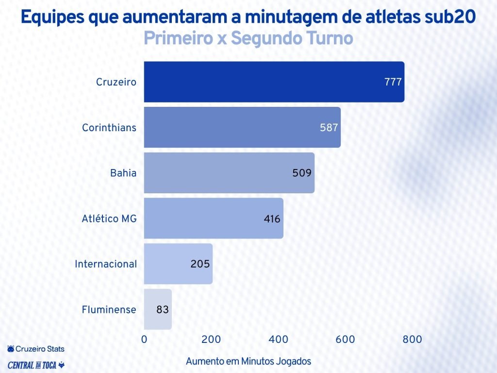 O Cruzeiro foi o clube que mais ampliou a minutagem de atletas com 20 anos ou menos e, simultaneamente, o que mais reduziu o tempo de jogo de seus veteranos. Esse duplo movimento revela uma mudança estrutural na política de utilização do elenco: menos dependência de jogadores em fim de carreira e mais espaço para jovens com potencial de desenvolvimento.