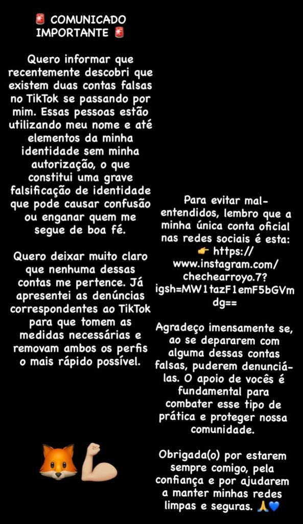 “Quero deixar muito claro que nenhuma dessas contas me pertence. Já apresentei as denúncias correspondentes ao TikTok para que tomem as medidas necessárias e removam ambos os perfis o mais rápido possível. Para evital mal-entendidos, lembro que a minha única conta oficial nas redes sociais é esta: https://www.instagram.com/chechearroyo.7/“, completou o atacante.