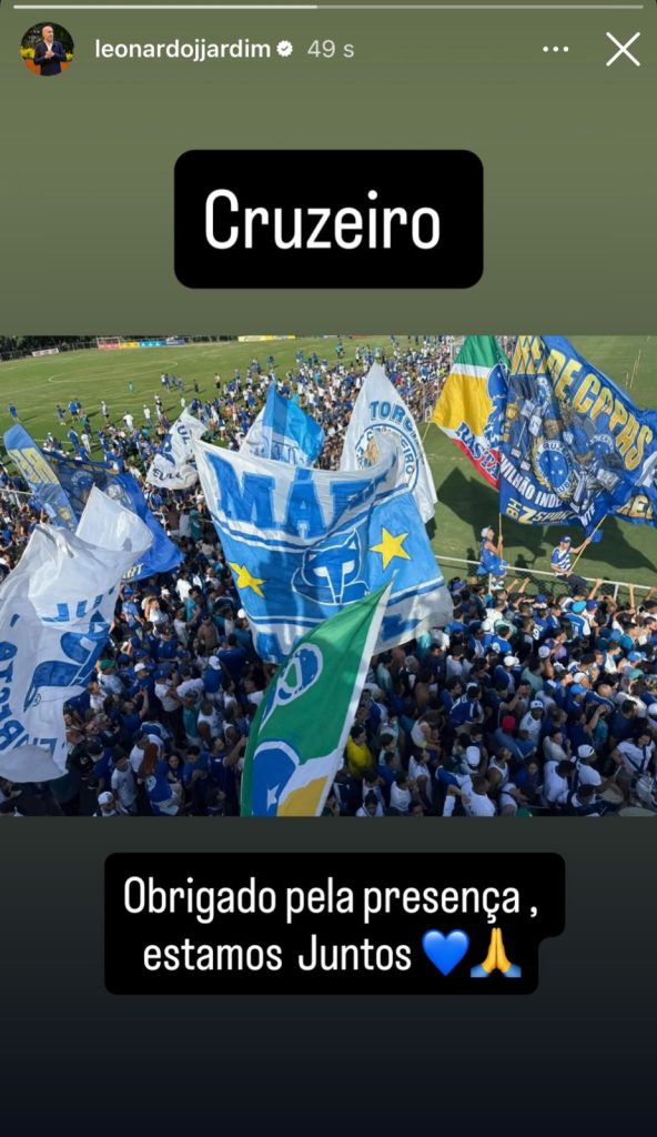 Técnico do Cruzeiro, Leonardo Jardim foi às redes sociais, na tarde deste sábado (13), para mandar um recado aos torcedores que foram até a Toca da Raposa II, em Belo Horizonte, para apoiar a equipe antes da decisão pela Copa do Brasil.